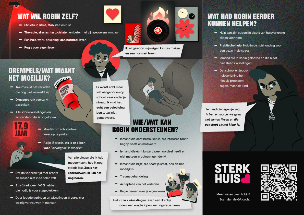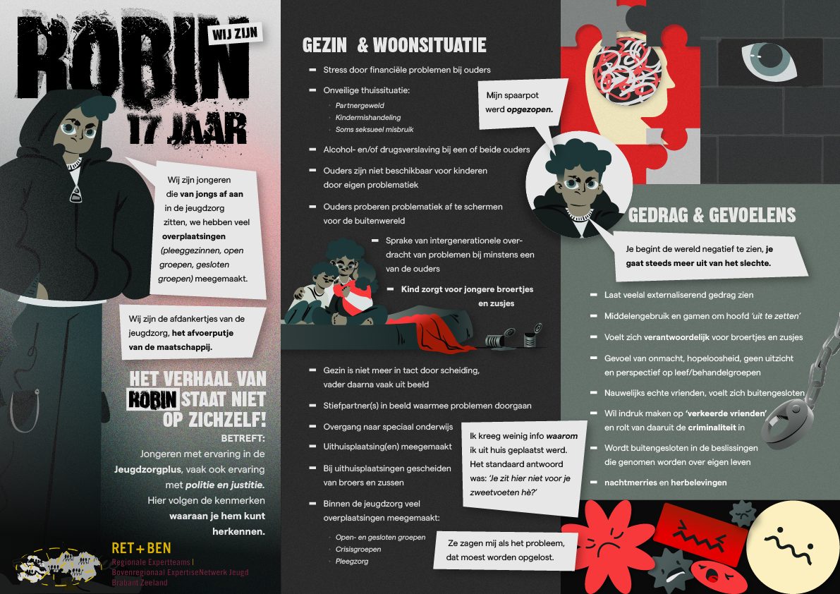 De persona Robin – hieronder – is binnen een samenwerkingsverband ontwikkeld om inzicht te geven in de leefwereld van jongeren met complexe problemen in de jeugdzorg. Robin is een echte vertegenwoordiger van de ervaringen van vele jongeren die te maken hebben met uithuisplaatsingen, overplaatsingen, trauma’s, onveiligheid en gebrek aan regie. We brachten Robin tot leven, zodat we hen samen beter begrijpen, eerder signaleren welke hulp zij nodig hebben, wat het beste past en helpt.