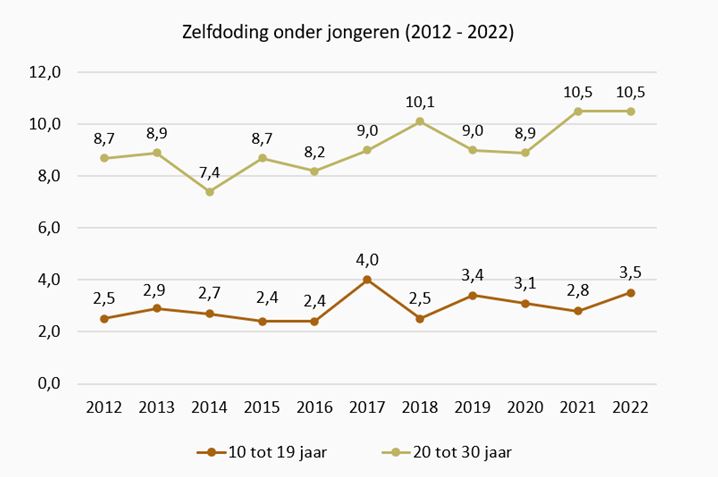 In Nederland is zelfmoord doodsoorzaak nummer één onder jongeren tussen de 10 en 25 jaar. In onderstaand overzicht is het verloop over de jaren te zien (NJI, 2023).